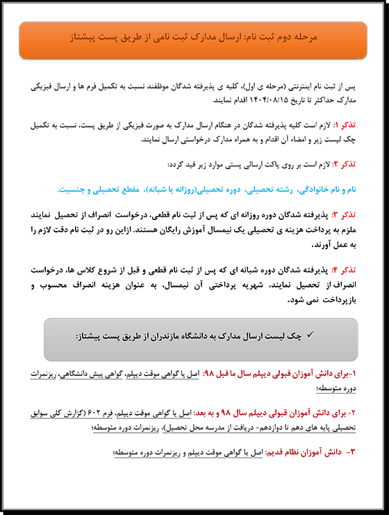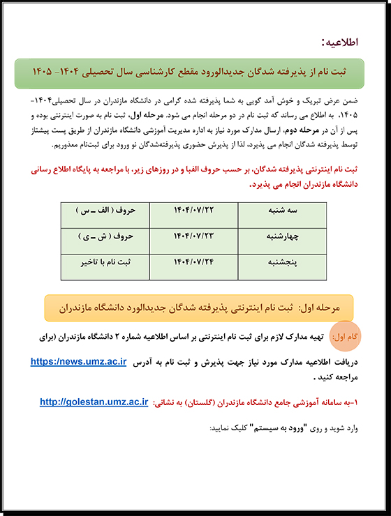 اطلاعیه شماره 3 درخصوص زمان و نحوه ثبت نام پذیرفته شدگان نو ورود سال تحصیلی 1404 دانشگاه مازندران - دانشگاه مازندران