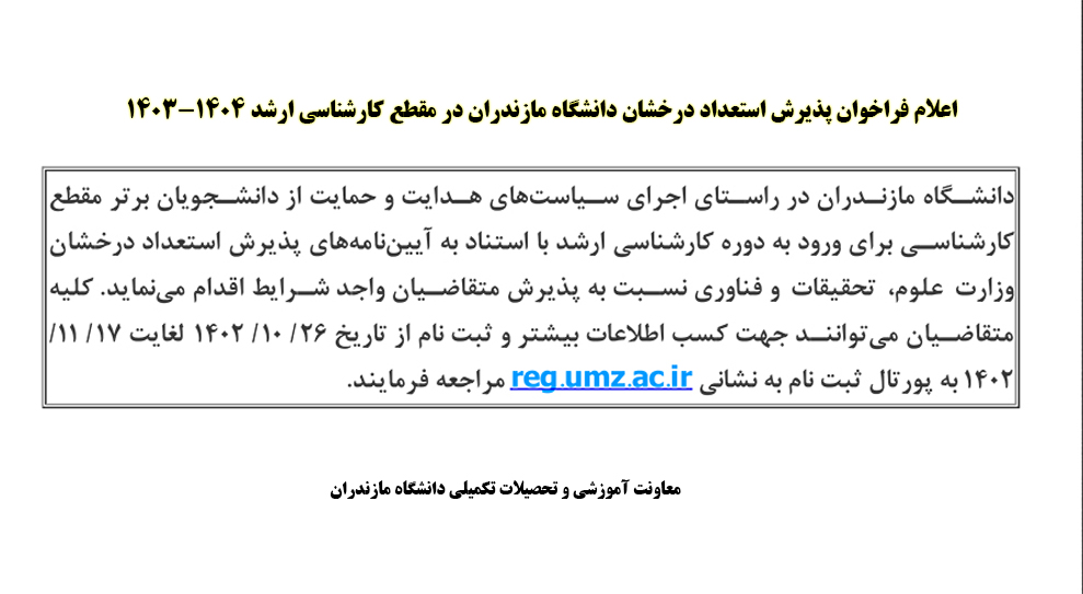 اعلام فراخوان پذیرش استعداد درخشان دانشگاه مازندران در مقطع کارشناسی ارشد 1403-1404
