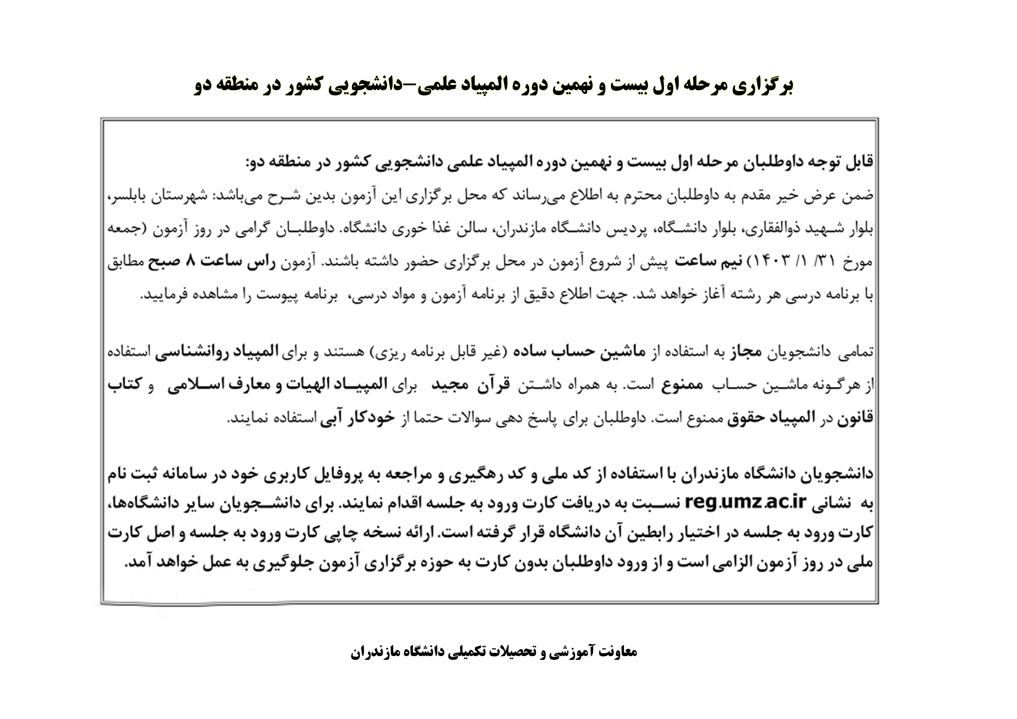برگزاری مرحله اول بیست و نهمین دوره المپیاد علمی-دانشجویی کشور در منطقه دو - دانشگاه مازندران