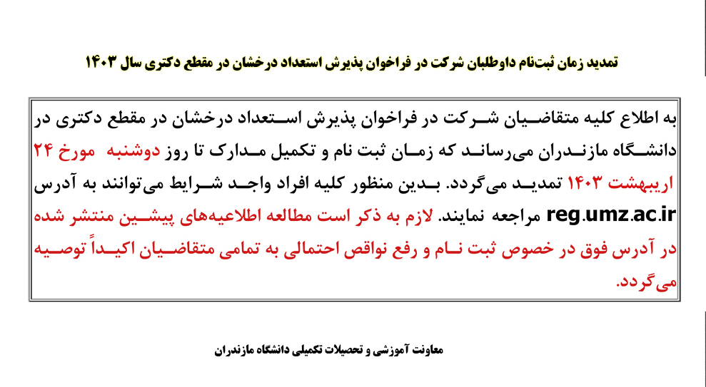 تمدید زمان ثبت نام داوطلبان شرکت در فراخوان پذیرش استعداد درخشان در مقطع دکتری سال 1403 - دانشگاه مازندران