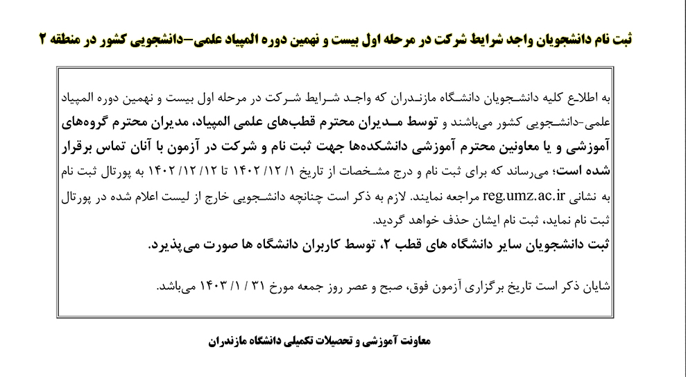 ثبت نام دانشجویان واجد شرایط شرکت در مرحله اول بیستونهمین دوره المپیاد علمی-دانشجویی کشور در منطقه 2 - دانشگاه مازندران