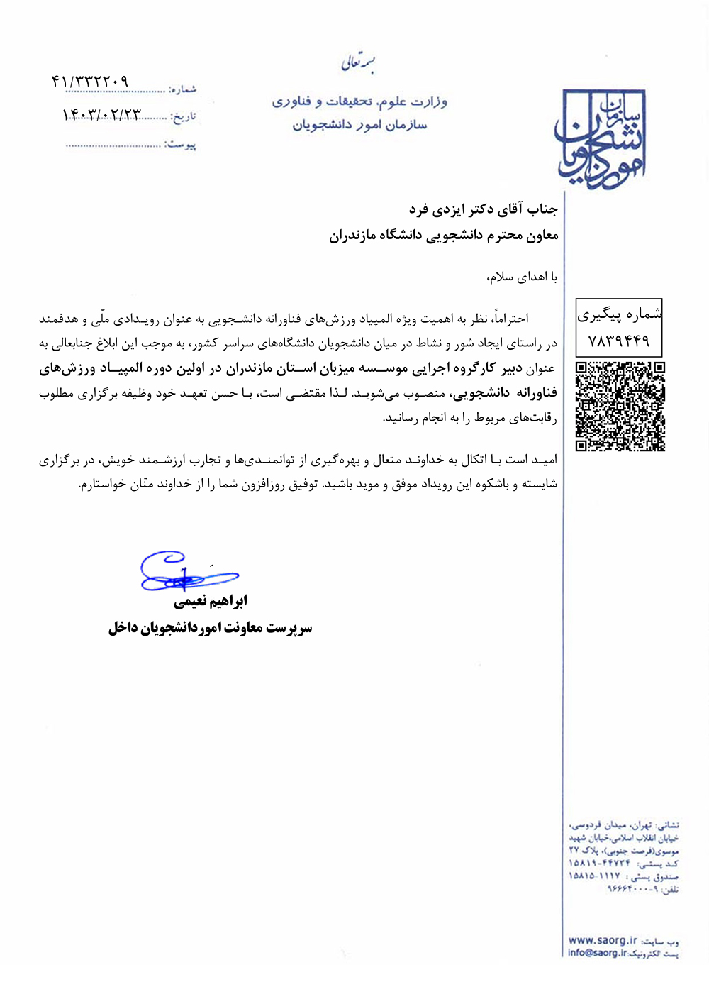 دبیر کارگروه اجرایی موسسه میزبان استان مازندران در اولین دوره المپیاد ورزشهای فناورانه دانشجویی منصوب شد