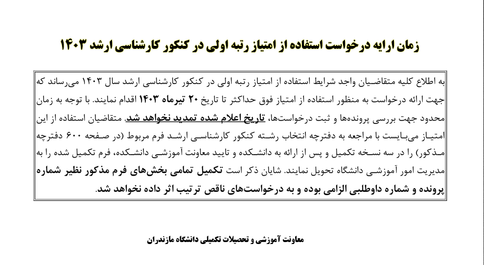 زمان ارایه درخواست استفاده از امتیاز رتبه اولی در کنکور کارشناسی ارشد 1403 - دانشگاه مازندران