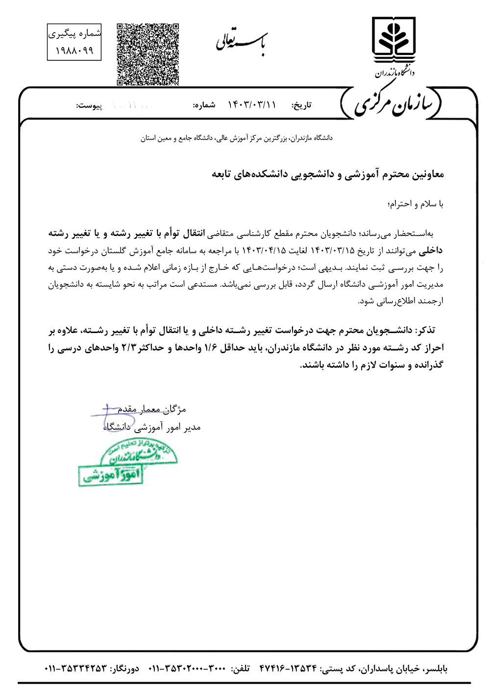 زمان ثبت درخواست انتقال توام با تغییر رشته و یا تغییر رشته داخلی - دانشگاه مازندران
