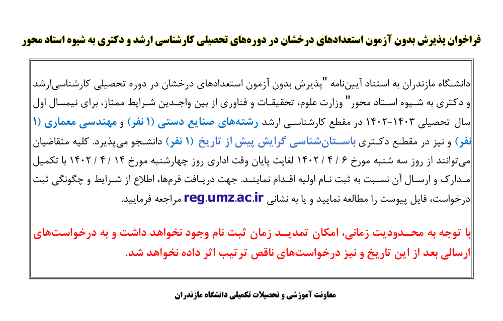 فراخوان پذیرش بدون آزمون استعدادهای درخشان در دورههای تحصیلی کارشناسی ارشد و دکتری به شیوه استاد محور - دانشگاه مازندران