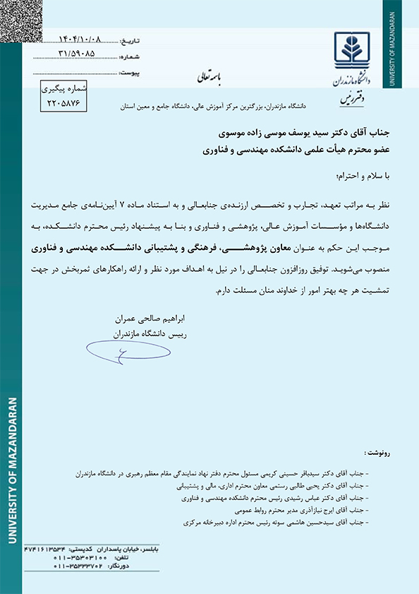 معاون پژوهشی، فرهنگی و پشتیبانی دانشکده مهندسی و فناوری دانشگاه مازندران منصوب شد