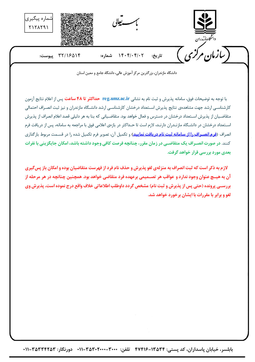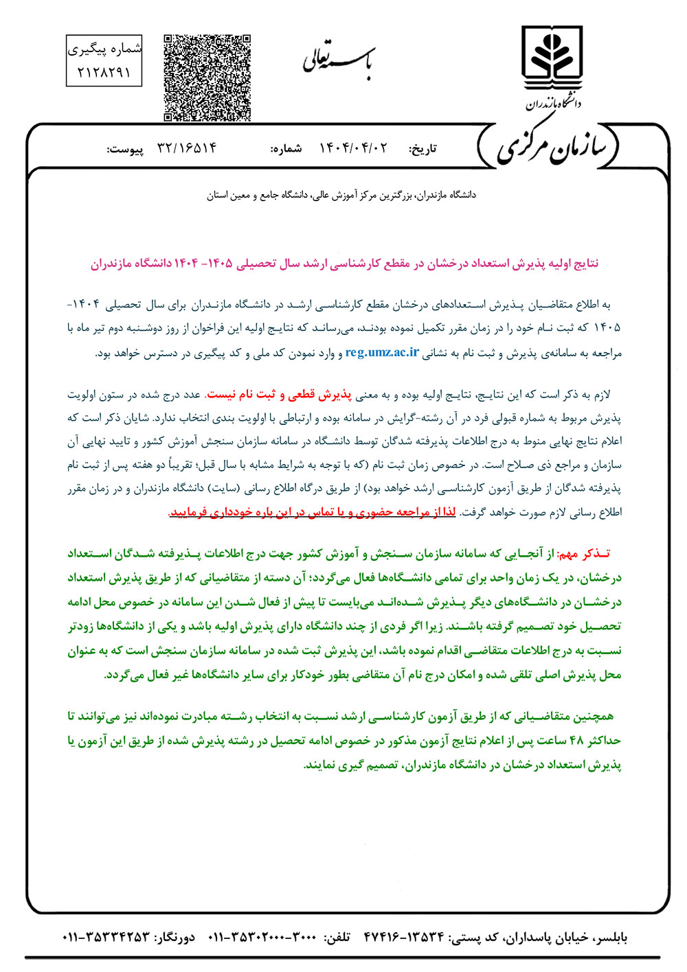 نتایج اولیه پذیرش استعداد درخشان در مقطع کارشناسی ارشد سال تحصیلی 1405 - 1404 - دانشگاه مازندران