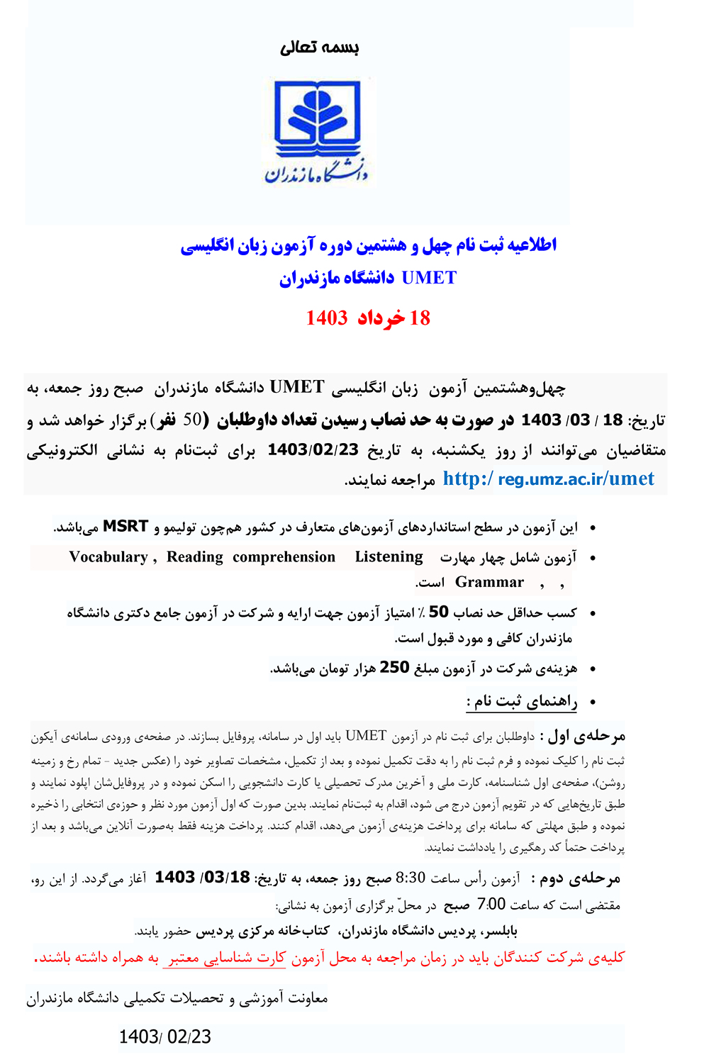 چهلوهشتمین آزمون زبان انگلیسی UMET دانشگاه مازندران